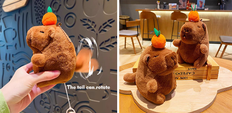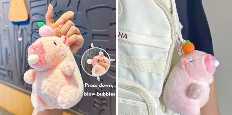 Con Capybara como diseño central, la imagen muestra la forma lujosa de Capybara. Este material lujoso puede representar mejor la apariencia del Capybara, y la imagen general es extremadamente adorable. Capybara viene en dos colores diferentes, a saber, rosa y marrón. En sus cabezas hay diferentes frutas, como caquis, duraznos y manzanas, y sus ojos están entrecerrando los ojos. Este llavero Capybara Plush también tiene una función interactiva. Mientras tire de la cuerda, su cola puede girar. Cuando pellizques su cara, puede soplar burbujas, y al soplar burbujas, incluso puede hacer sonidos. Sus habilidades únicas pueden atraer más efectivamente a los clientes y ganar su favor.