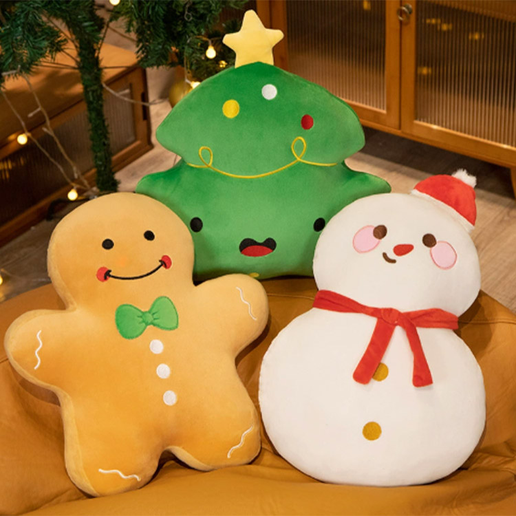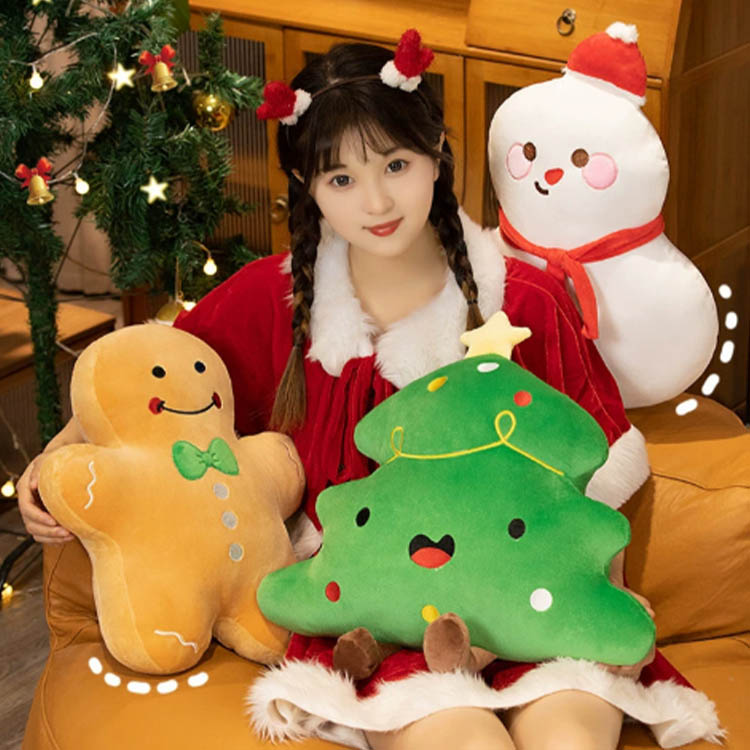 Este juguete de peluche es de estilo navideño. Los estilos son muy populares, incluidos los peluches de pan de jengibre, los pequeños muñecos de nieve y los árboles de Navidad. Todos sus tejidos están hechos de felpa y rellenos de algodón PP en su interior. No solo son bonitos y adecuados para la decoración de habitaciones, sino que también se pueden utilizar como cojines y almohadas, lo cual resulta muy práctico.