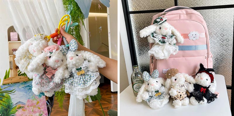 Entre estos pequeños conejos, algunos usan vestidos pequeños, algunos usan pequeños delantales y otros usan pequeñas bufandas. Su ropa se puede cambiar de ida y vuelta. Puede hacer su propio bricolaje para este colgante y crear su propio estilo de juego. Su ropa es muy exquisita, con decoraciones de encaje, y son extremadamente hermosas. Además, los conejos también tienen accesorios: flores de mariposa y un pequeño sombrero. Algunos incluso tienen una bolsa adjunta.